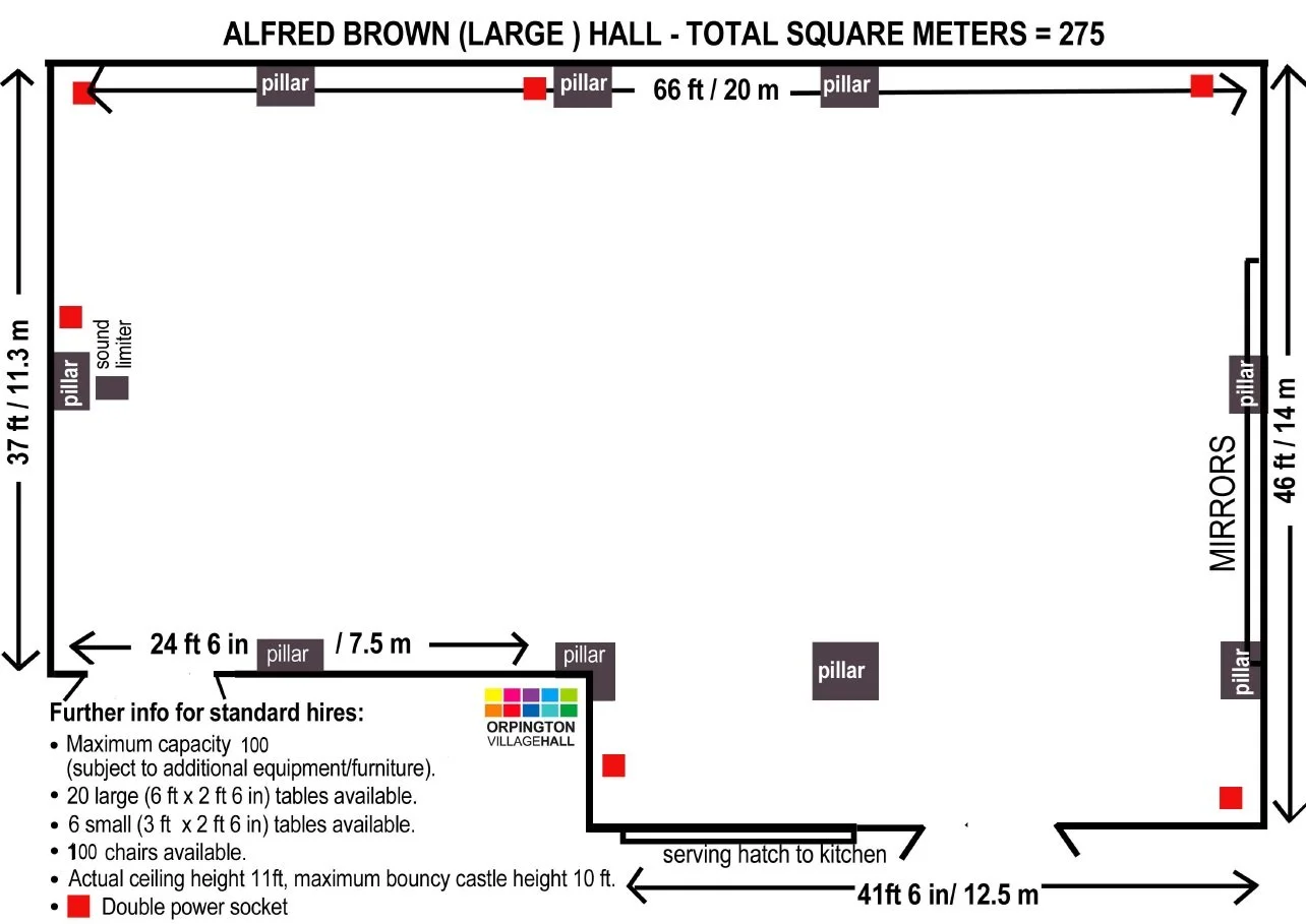 The Alfred Brown Hall is the larger of the two halls available for hire at our venue. With beautiful ash wooden sprung flooring and air conditioning/heating for year round comfort to your specifications. It has a floor area of 275sqm or 900sqft and a ceiling height of 3.35m/11ft. Its capacity depends on how the room is set up.