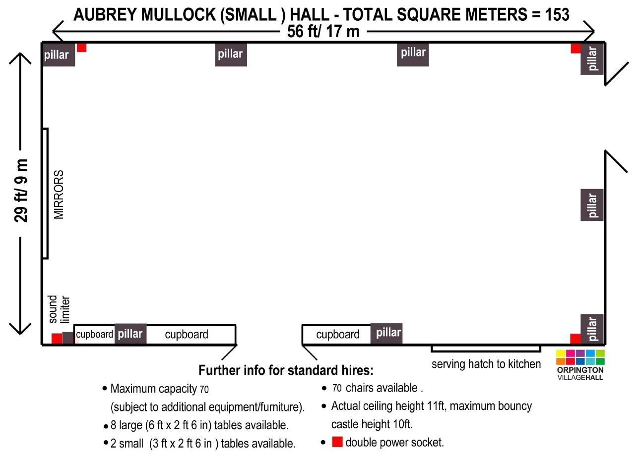 The Aubrey Mullock Hall is the smaller of the two halls available for hire at our venue. With beautiful ash wooden sprung flooring and air conditioning/heating for year round comfort to your specifications. It has a floor area of 153sqm or 500sqft and a ceiling height of 3.35m/11ft. Its capacity depends on how the room is set up.